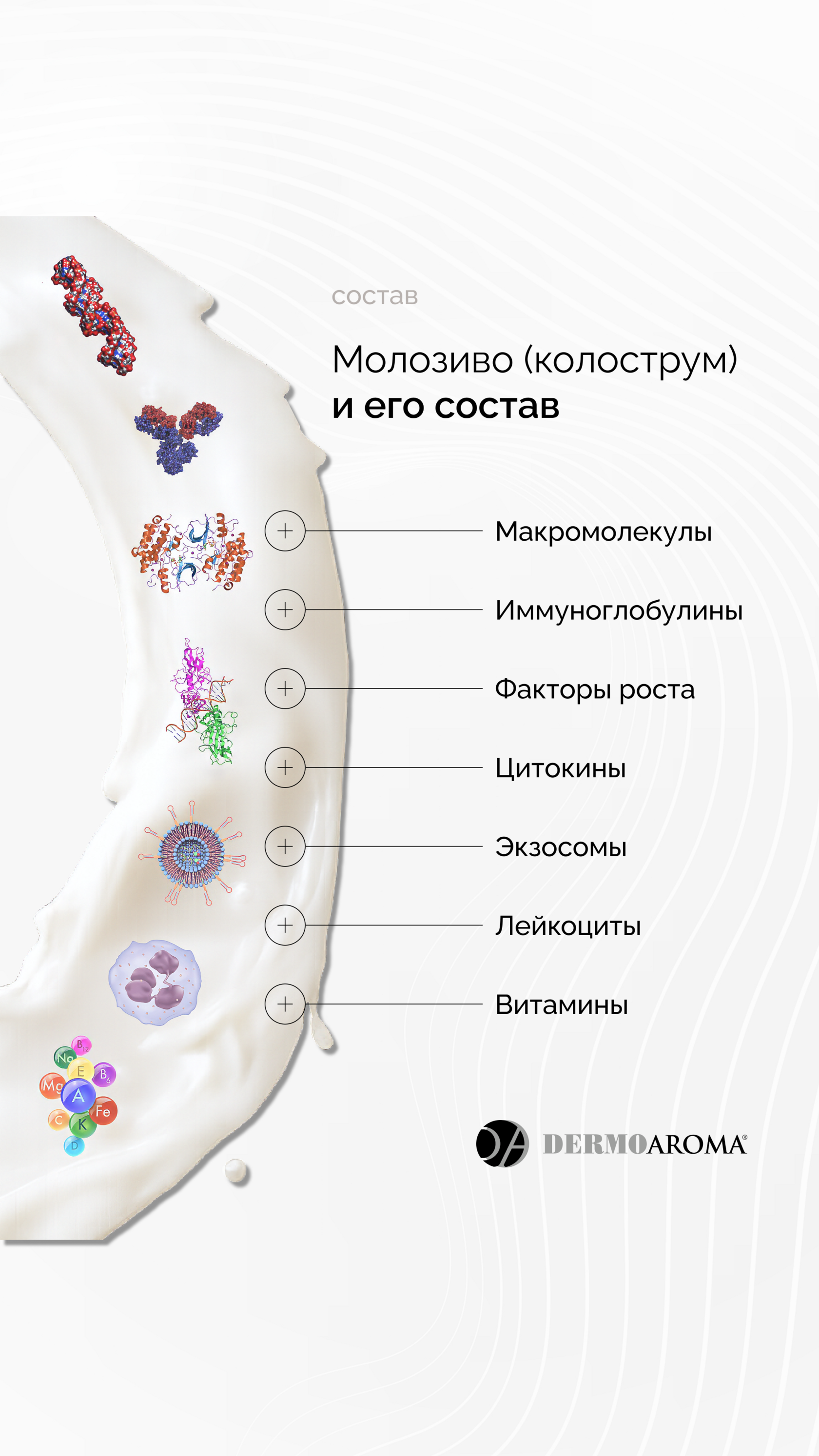 Компания Dermoaroma (Италия) вывела применение молозива на новый уровень, выделяя из него секретом — богатый комплекс биологически активных молекул, включающий: